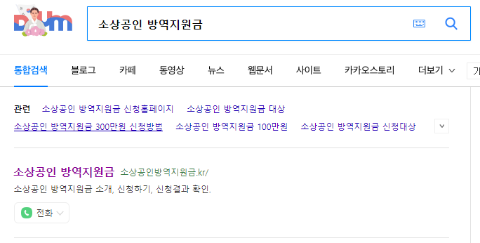 다움이나 네이버 검색 사이트에서 소상공인 방역지원금을 검색합니다.