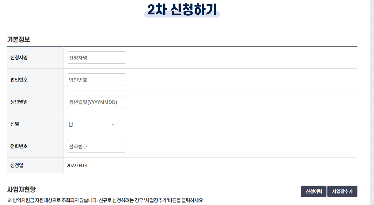 2차 신청하기에서 신청자명, 사업자번호, 생년월일, 전화번호, 본인계좌를 입력합니다.