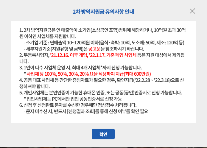 아래와 같은 2차 방역지원금 유의사항 안내 창이 뜹니다.