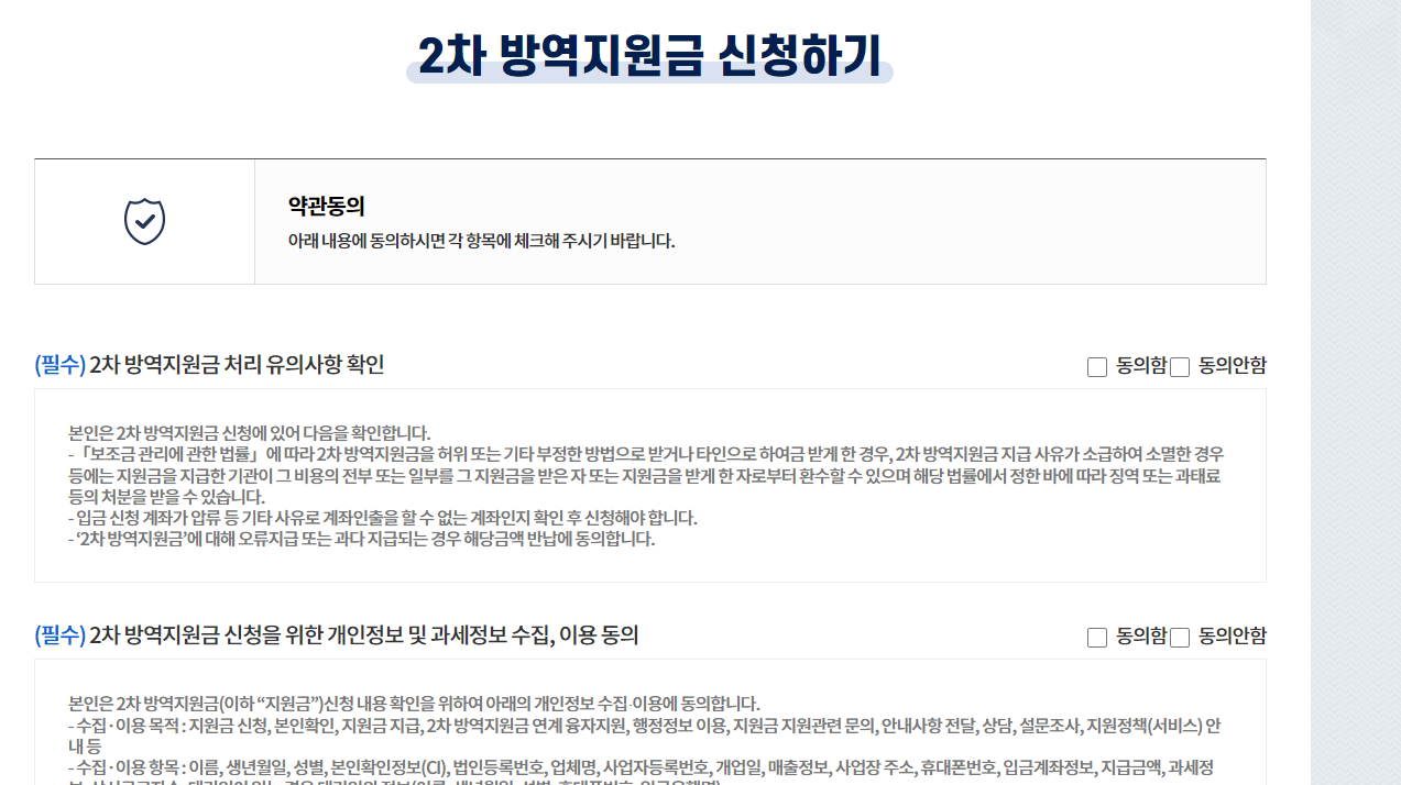 다음으로 방역지원금 신청하기에서 약관 동의합니다.